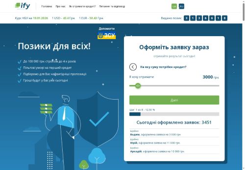ify.ua - это именно тот сервис, который помогает в трудную минуту. Взял займ в первый раз, и переживал по поводу многократных переплат. Но на сайте ... Ещё ify.ua - это именно тот сервис, который помогает в трудную минуту. Взял займ в первый раз, и переживал по поводу многократных переплат. Но на сайте есть множество компаний с низкими процентами. Заполнение заявки было простым и без лишних бумаг. Деньги пришли на счет быстро, и я остался доволен. Теперь я регулярный клиент и всем советую этот сервис!