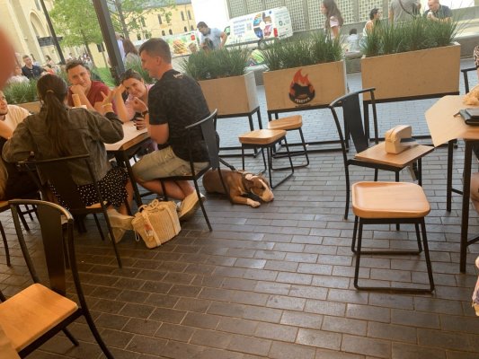 Мы и посетители рядом сидели с маленькими детьми. Попросили позвать администратора, который совершенно четко заявила нам, что правилами ресторана не запрещено его посещение посетителей с собаками без намордников.